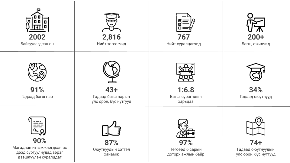 Манай оюутнууд эрдэм мэдлэг хуримтлуулахаас гадна бие даан суралцах, шинийг эрэлхийлэх, багаар ажиллах, цаг төлөвлөх, бүтээлчээр сэтгэх зэрэг олон чадваруудыг эзэмшин төгсдөг. Цаашид бид Монгол улс төдийгүй олон улсын түвшинд өрсөлдөхүйц шилдэг удирдагчдыг бэлтгэх үйл хэрэгт хувь нэмрээ оруулан, таныг амжилт өөд хөтлөх гүүр болон ажиллахыг зорино.